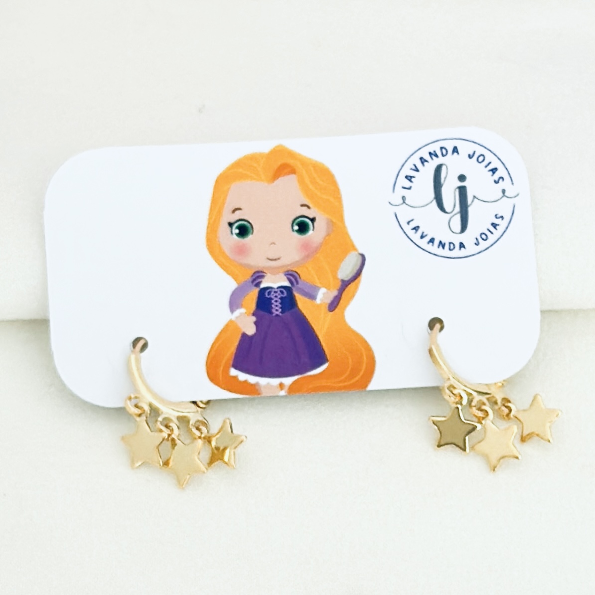 - Caixa personalizada com Brinco Argolinha estrelas; cartão de cuidados/garantia.