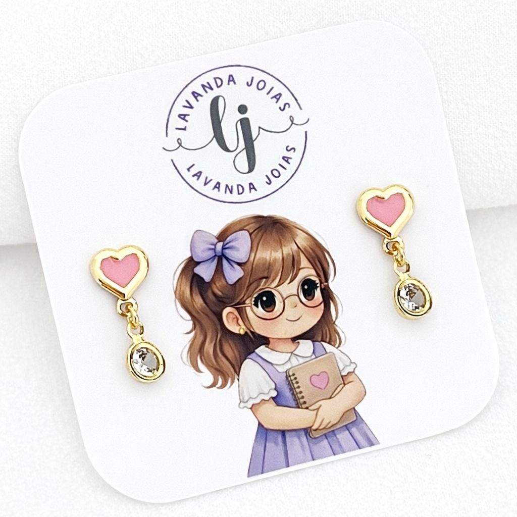 Brinco Coração Rosa com pingente ponto de Luz cravejado com zircônia cristal, em banho ouro 18k