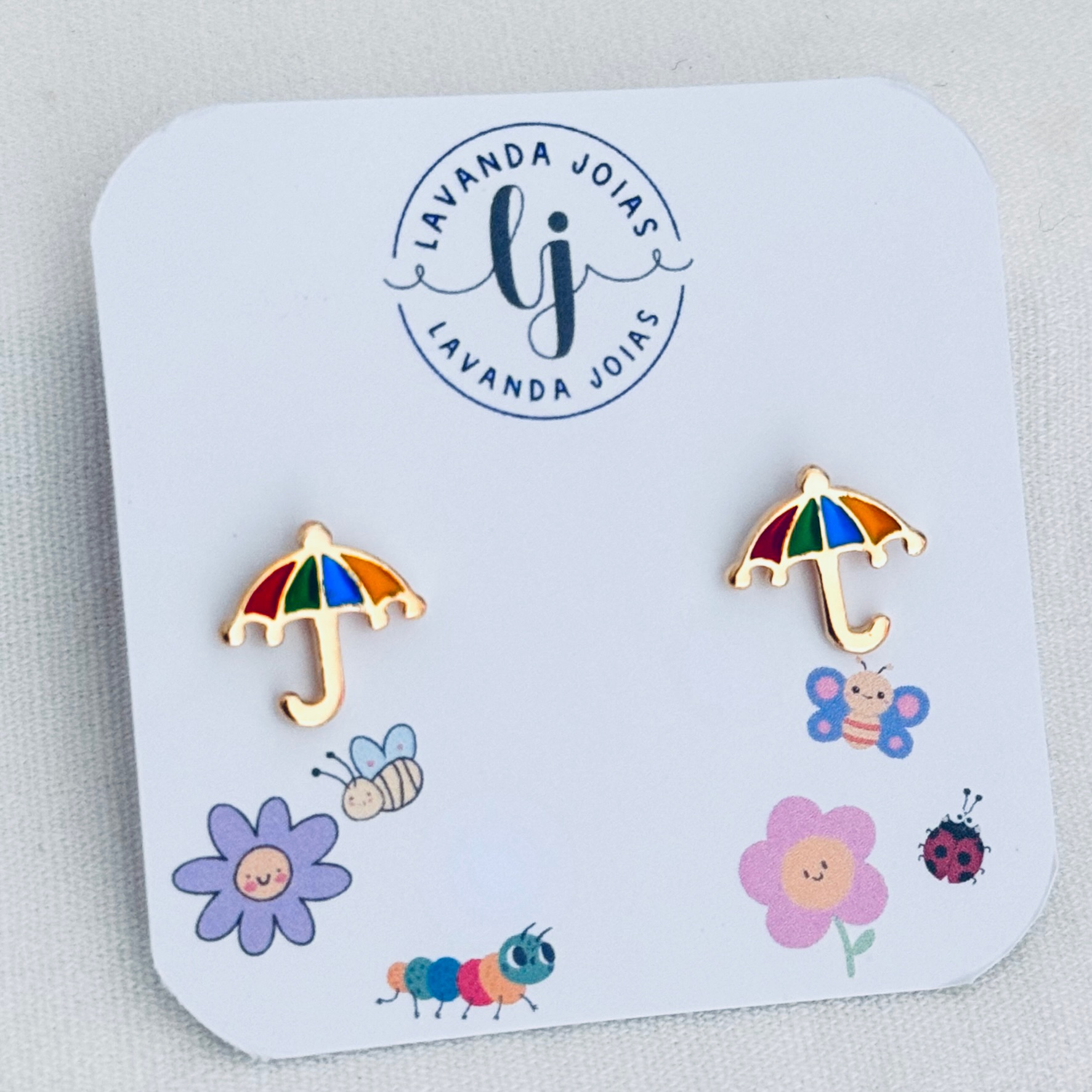 O brinco Guarda-chuva Colorido traz um toque divertido e alegre para o visual das pequenas. ☂️