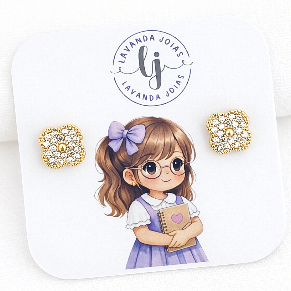 Delicado e cheio de significado, o brinco flor trevo da sorte é uma peça especial para acompanhar a rotina escolar com leveza e conforto. Seu formato delicado une a suavidade da flor com o simbolismo do trevo, representando proteção, alegria e bons caminhos — perfeito para o dia a dia das crianças.