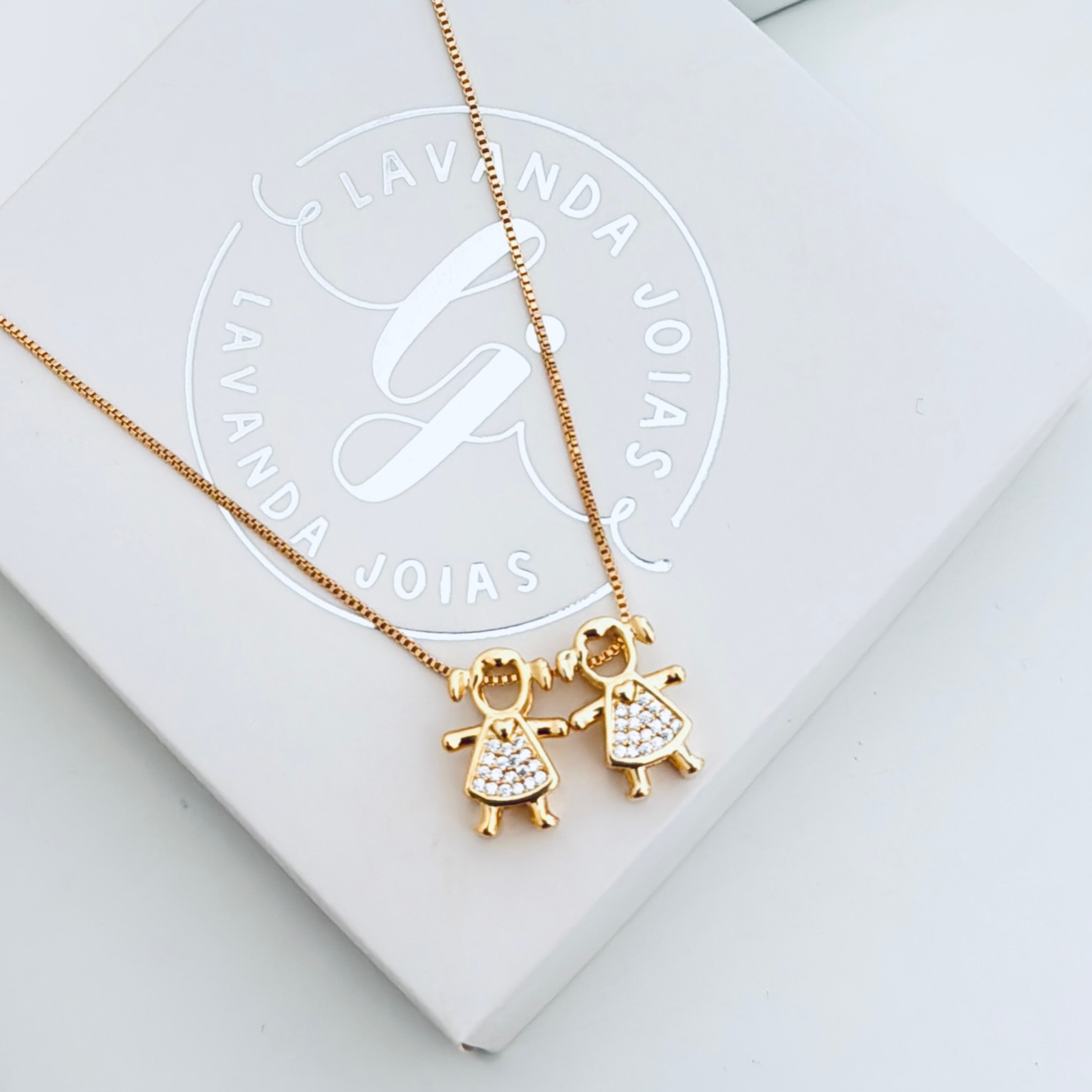 - Colar com pingente cravejado 2 meninas cristal;