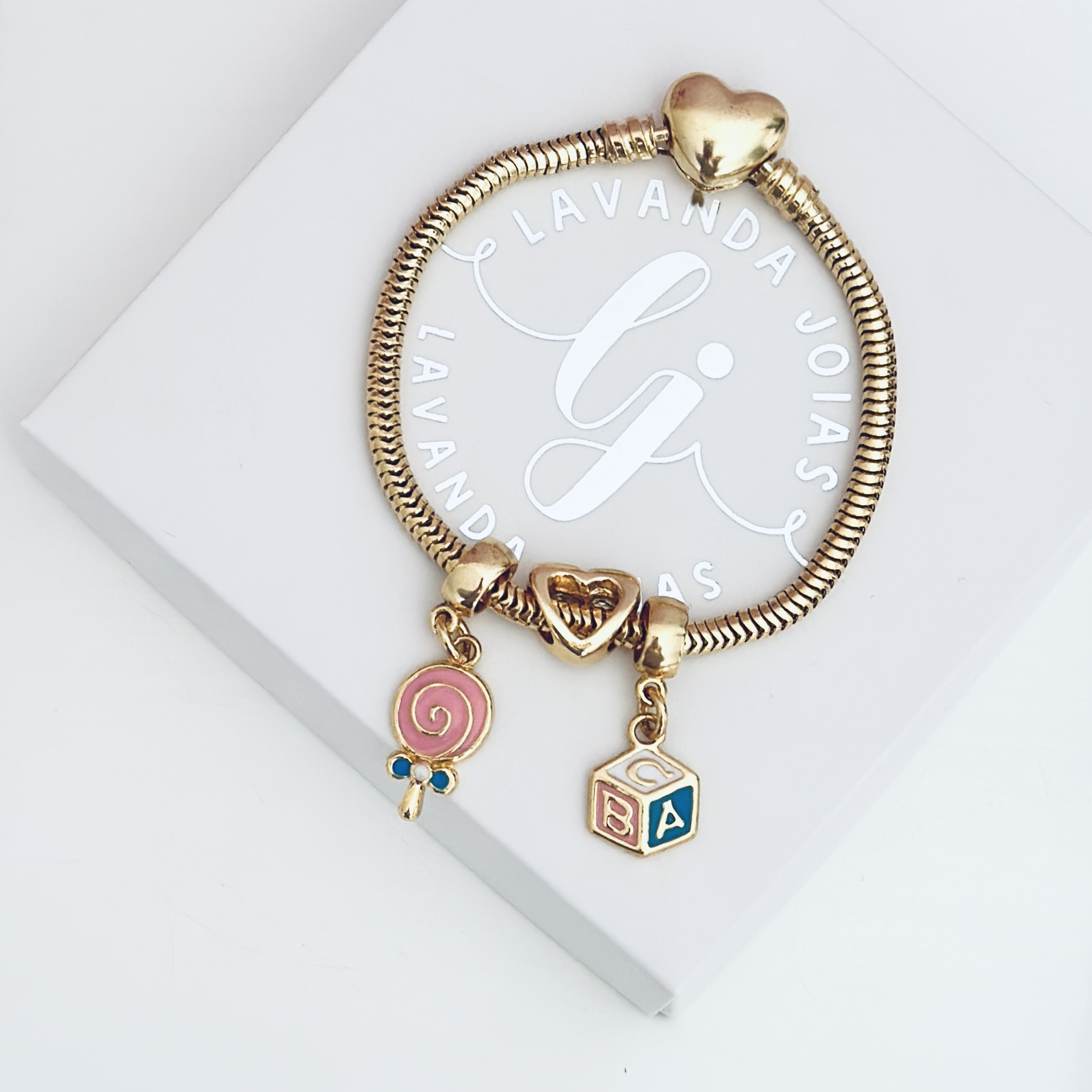 -Pulseira em banho ouro 18k com 3 Berloques: ABC; coração e Pirulito